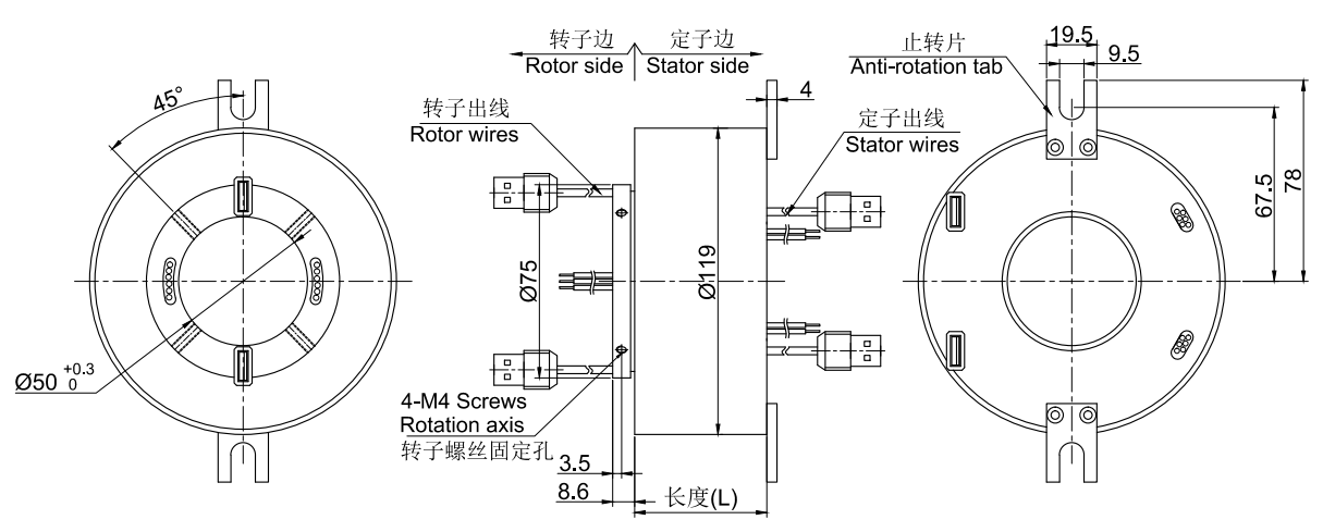 • · MUSB2502系列USB滑環, 內孔50mm, 外徑為標準119mm的緊湊型整體式結構的2通道 USB1.0/USB2.0整體式精密導電滑環,