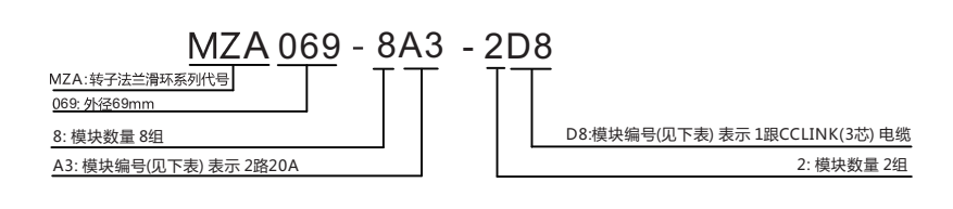 *比如MZA069-8A3-2D8, 其中8A3-2D8是指:8組2路20A(即16路20A)+2組1根CCLINK(3芯)電纜